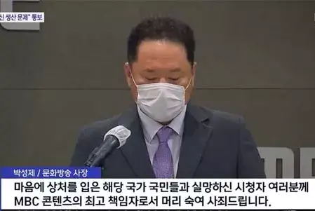 박성제 사장은 이어 "신중하지 못한 방송, 참가국에 대한 배려가 결여된 방송으로 마음에 상처를 입은 해당 국가 국민들과 실망하신 시청자들께 MBC 콘텐츠 최고 책임자로서 머리 숙여 사죄드린다"고 밝혔습니다.